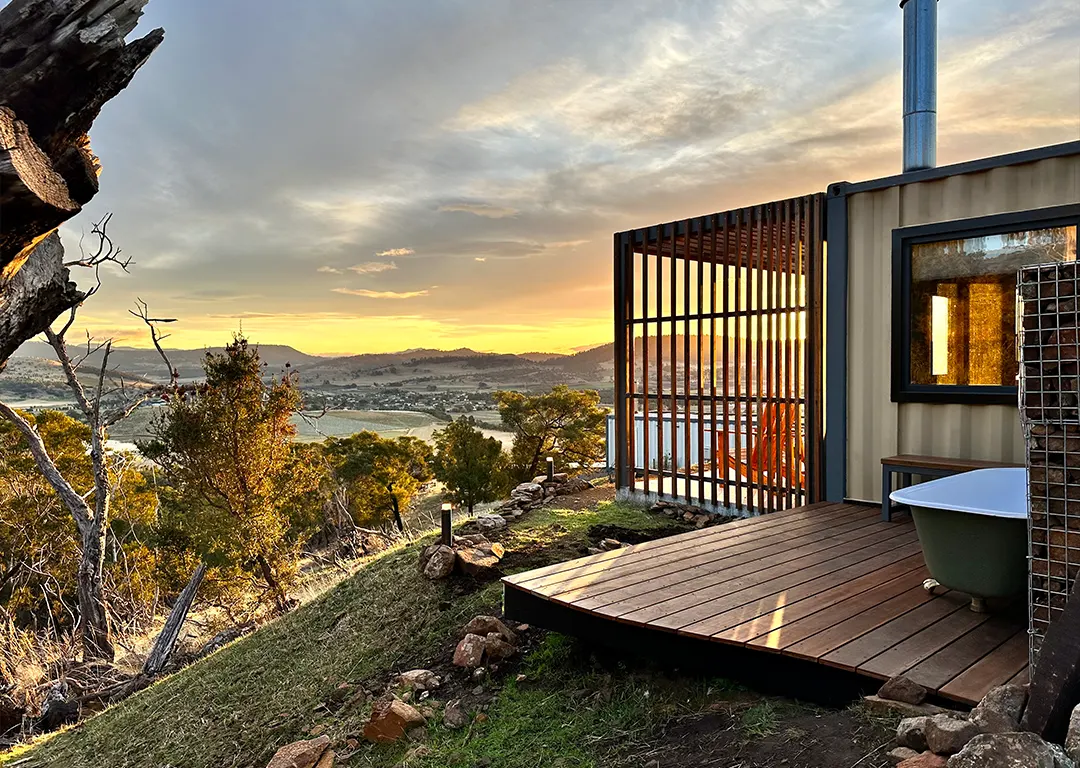 Embrace the natural environment as you slip into the warmth of a hot outdoor, refurbished Victorian-era clawfoot bath. Eco Pod Melaleuca is perched in complete seclusion, offering spectacular views of rolling hills stretching to the majestic kunanyi/Mt Wellington. Romantic fairy lights and a gabion wall with a shelf for your glass of local Coal River Valley bubbles make this outdoor bathing experience truly unforgettable.