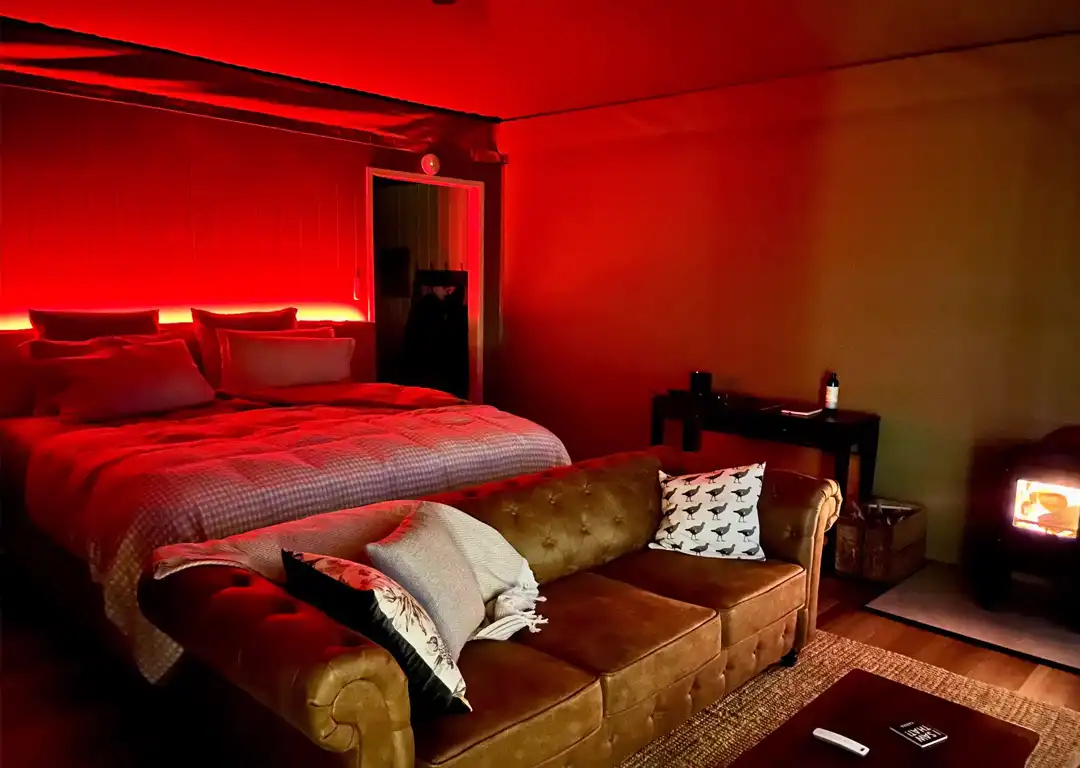 Immerse yourself in this peaceful oasis where romance, elegance, and style converge. The glamping tent is a true masterpiece with all the luxuries of a five-star hotel – mood lighting, a plush king-sized bed which rests against a Huon pine backdrop, lavish throws and cushions, and a wood heater to keep you snug. There’s a kitchenette to keep your sparkling wine chilled and make your fresh morning coffee.