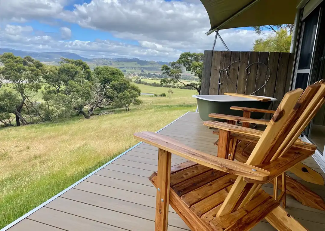 Venture onto the deck and marvel at the idyllic vista before you – rolling hills as far as you can see with striking sandstone cliffs and kunanyi/Mt Wellington in the distance. Let your cares drift away as you soak in the grand refurbished Victorian-era clawfoot bath on the deck. Feel the gentle breeze touch your skin as you sip on a glass of sparkling. Welcome to bliss.