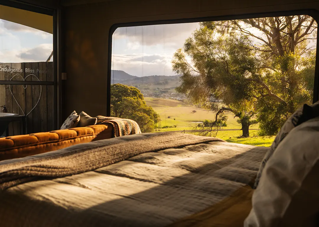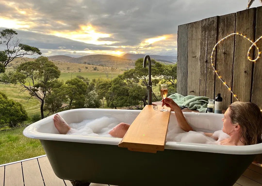 Venture onto the deck and marvel at the idyllic vista before you – rolling hills as far as you can see with striking sandstone cliffs and kunanyi/Mt Wellington in the distance. Let your cares drift away as you soak in the grand refurbished Victorian-era clawfoot bath on the deck. Feel the gentle breeze touch your skin as you sip on a glass of sparkling. Welcome to bliss.