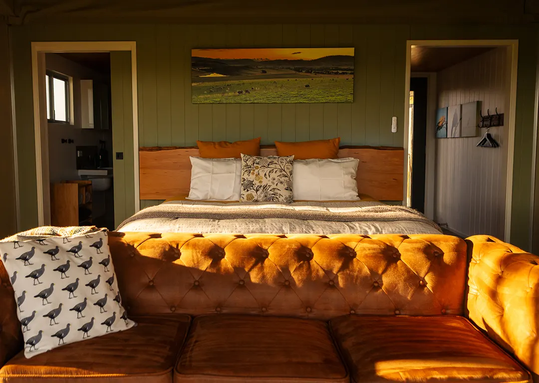 Immerse yourself in this peaceful oasis where romance, elegance, and style converge. The glamping tent is a true masterpiece with all the luxuries of a five-star hotel – mood lighting, a plush king-sized bed which rests against a Huon pine backdrop, lavish throws and cushions, and a wood heater to keep you snug. There’s a kitchenette to keep your sparkling wine chilled and make your fresh morning coffee.